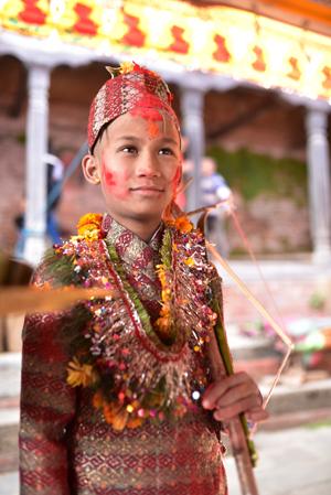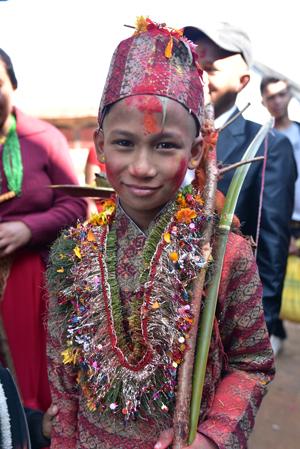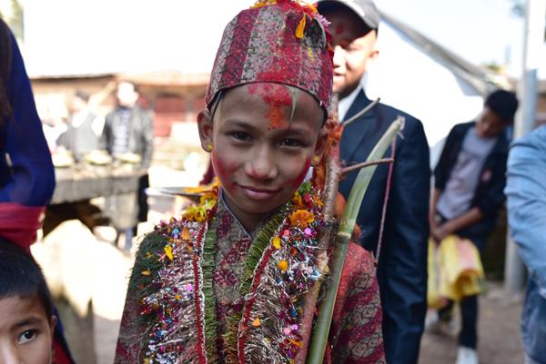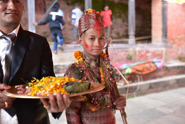 Et voici le marié… ou bien le frère du marié qui est également de la partie. Mais le costume traditionnel du petit est absolument magnifique, fait des plus beaux tissus auxquels sont cousus des fleurs naturelles. Bref, d’une beauté sans nom.