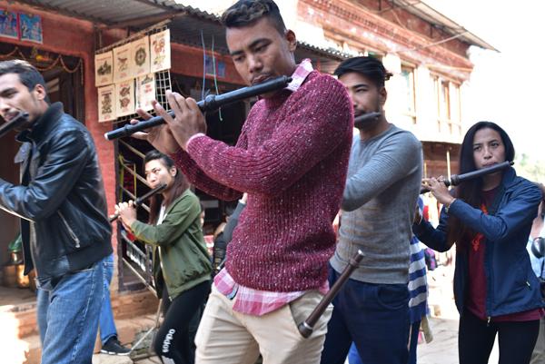 En attendant, les musiciens s’en donnent à coeur joie et accompagne le cortège à travers toutes les rues du village, puis serpentent entre les sanctuaires dressés au milieu de la cour du temple.