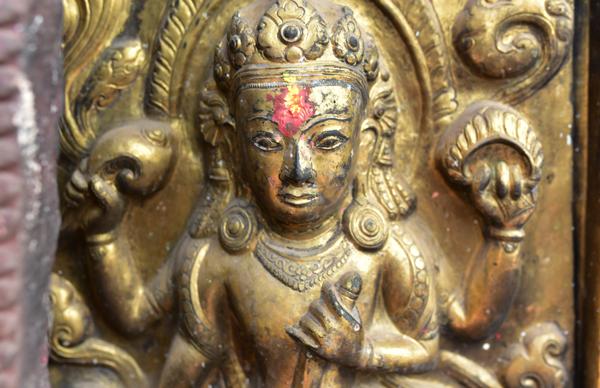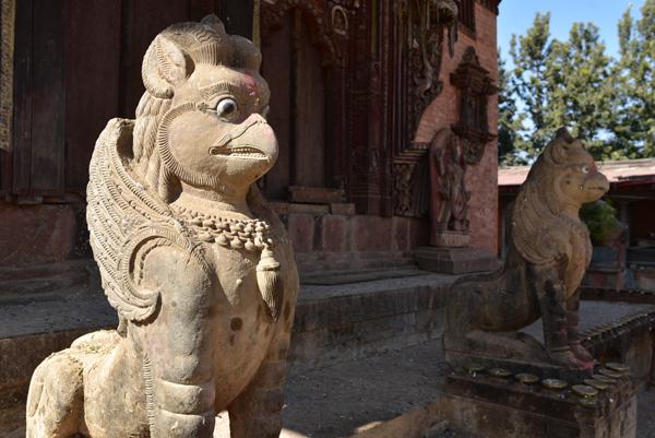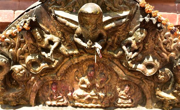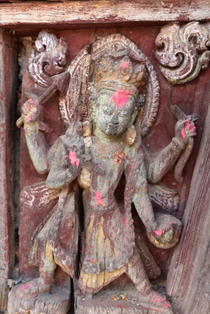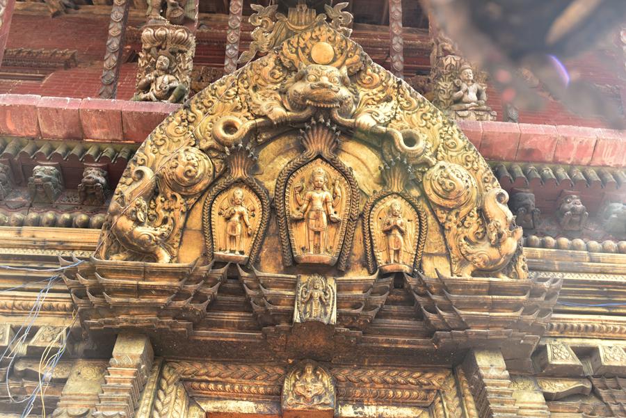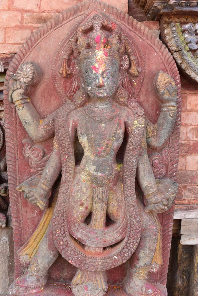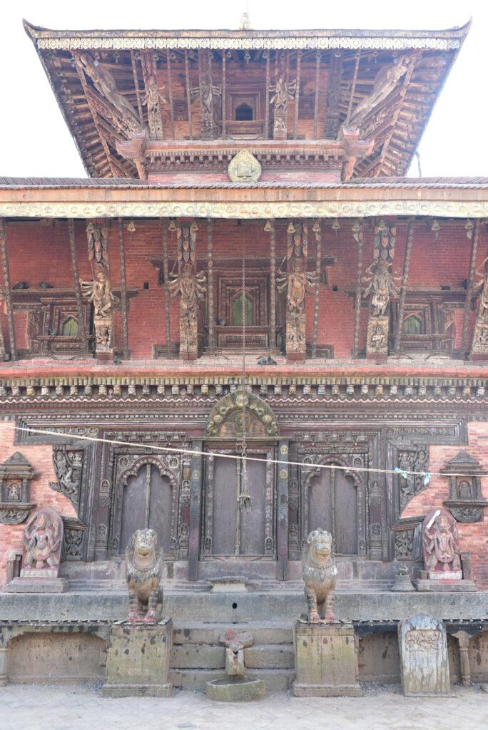 Voici donc le temple de Narayan. On peut voir sur le côté ouest, les portraits en bronze des donateurs, la reine Riddhilakshmi et son fils mineur, Bhujalendra Malla (1687-1700). Mais le fils était déjà mort lor de l’inauguration officielle, en 1704.