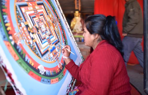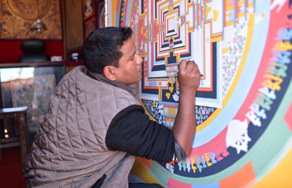 Devant la boutique encore, des artisans entreprennent la création d’immenses mandalas. Un travail d’expert qui nécessite patience et méticulosité. Il faut parfois un mois entier pour réaliser un seul mandala !