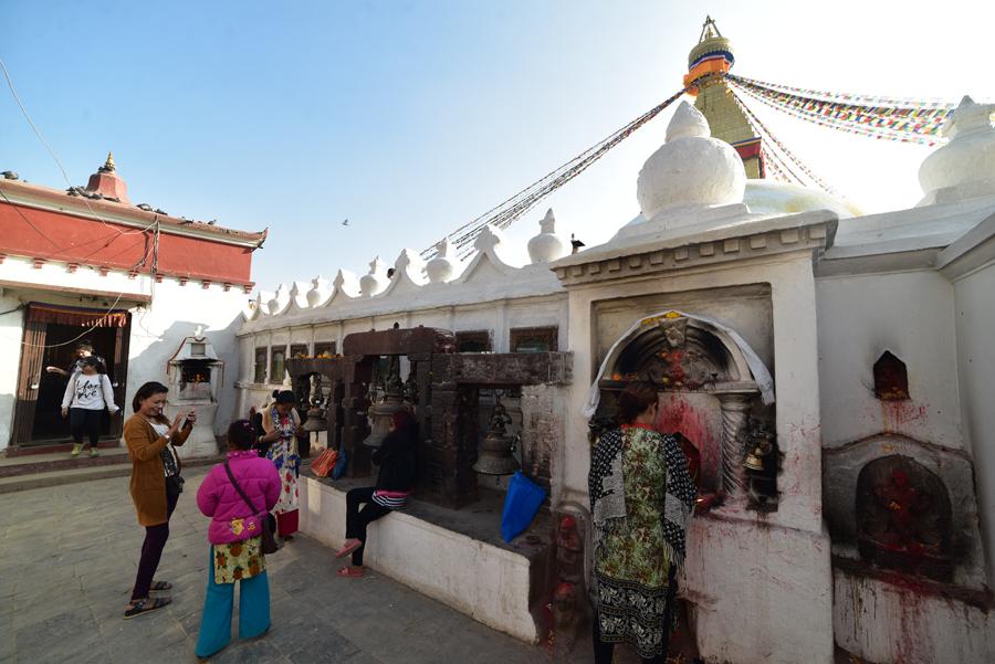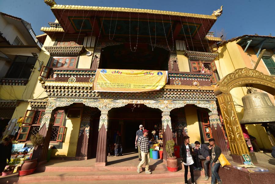 Plus de cinquante monastères tibétains entourent le stupa, formant un véritable village monastique où il fait bon se perdre. Autour de la place circulaire, une multitude d’échoppes religieuses et de salons de thé s’alignent, offrant aux visiteurs la possibilité de s’installer en terrasse pour observer pendant des heures la ferveur religieuse qui règne en contrebas. Au sommet de plusieurs bâtiments, des petits restaurants offrent une vue splendide sur le stupa, particulièrement magique au coucher du soleil quand la lumière dorée embrase la flèche et que les habitants allument les lampes à beurre.