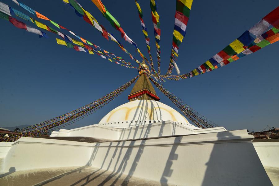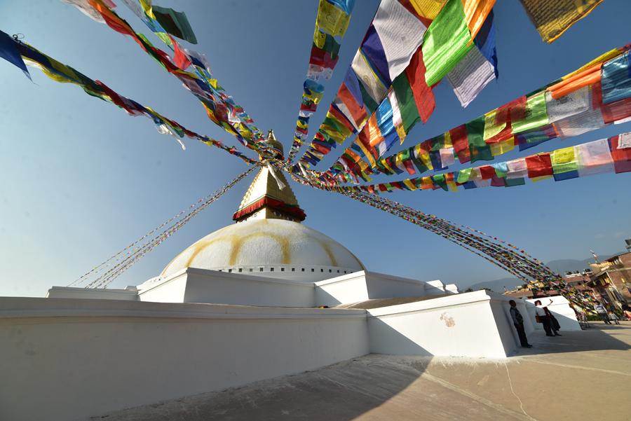 Dès les premiers pas dans le sanctuaire, on est immédiatement saisi par la puissance spirituelle qui se dégage du lieu. Avec une circonférence de cent mètres et une hauteur de trente-six mètres, le stupa de Bodhnath est le plus grand du Népal et force le respect. Sous les yeux de Bouddha, dessinés sur chaque face du monument et qui semblent vous observer où que vous soyez, on se sent tout petit. Les drapeaux de prières, virevoltant dans le vent, sont autant d’éclats de couleur qui contrastent avec la blancheur immaculée du dôme.