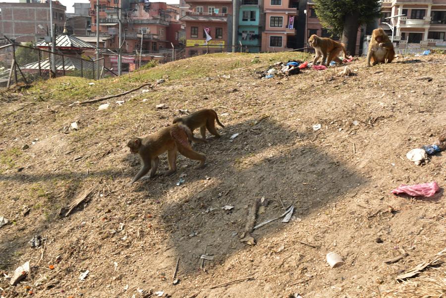 Au bout de l’allée principale se tient l’entrée du temple. Je vais pourtant la contourner pour essayer d’avoir une vue d’ensemble. Après une petite grimpette de quelques centaines de mètres, me voici au milieu d’un troupeau de vaches sacrées et de singes en liberté.