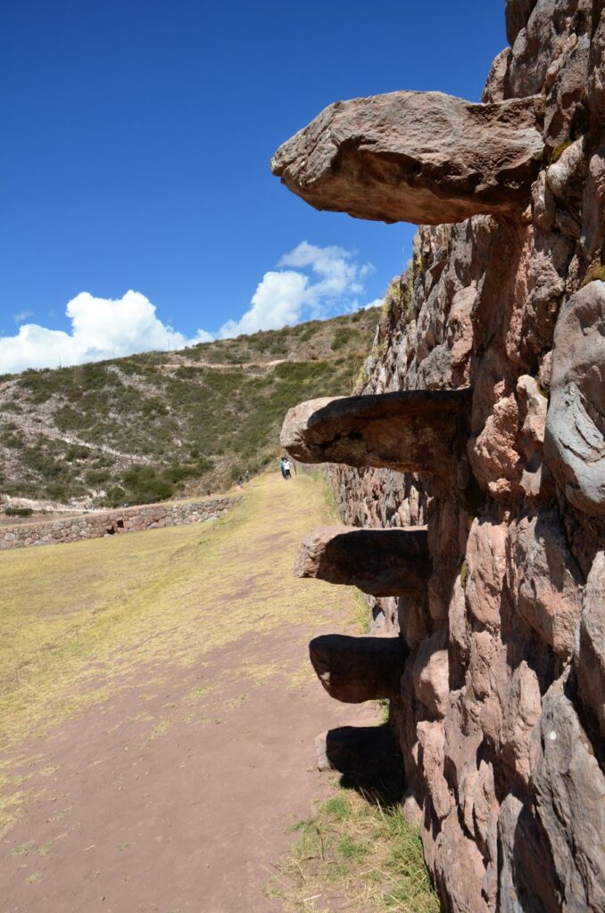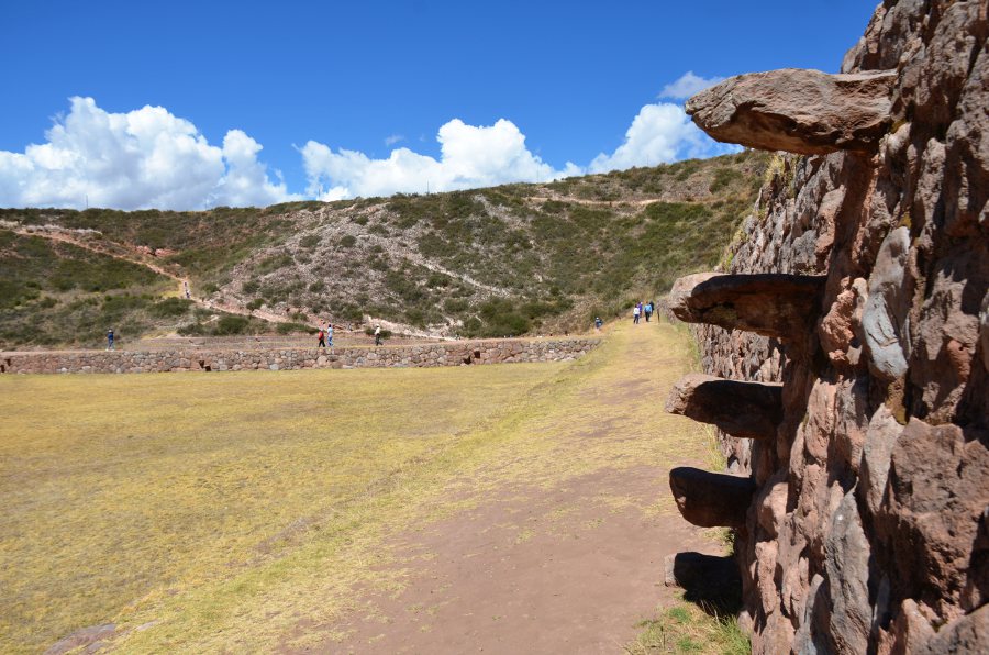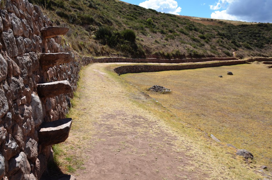 En longeant la piste circulaire qui domine le vaste amphithéâtre, on comprend bientôt comment les Incas accédaient aux différentes terrasses. Un ingénieux système de pierres incluses dans les murs de soutènement de chaque terrasse forme des escaliers. Il fallait y penser. Ils sont sympas, ces Incas !